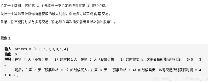 class Solution:def maxProfit(self, prices):#k代表交易次数,本题为0,1,2n = len(prices)k = 2dp = [[[0, 0] for i in range(k+1)] for _ in range(n)]for i in range(n):#边界条件1:第i天不买入是否持有的利润dp[i][0][0] = 0dp[i][0][1] = float('-inf')#用负无穷代表不可能# print(dp)for j in range(1, k+1):#边界条件2:第0天买入是否持有的利润dp[0][j][0] = 0dp[0][j][1] = -prices[0]for i in range(1, n):for j in range(1,k+1):dp[i][j][0] = max(dp[i - 1][j][0], dp[i - 1][j][1] + prices[i])dp[i][j][1] = max(dp[i - 1][j][1], dp[i - 1][j - 1][0] - prices[i])return dp[-1][-1][0]prices = [3,3,5,0,0,3,1,4]