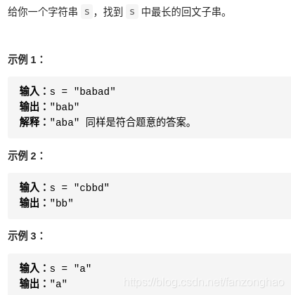public:string res;void help(int left, int right, string& s){while(left >= 0 && right < s.size() && s[left] == s[right]){left--;right++;}left++;right--;if(right - left + 1 > res.size()){res = s.substr(left, right - left + 1);}}string longestPalindrome(string s) {if(s.size() <= 1){return s;}for(int i=1; i<s.size(); i++){help(i-1, i+1, s);help(i-1, i, s);}return res;}