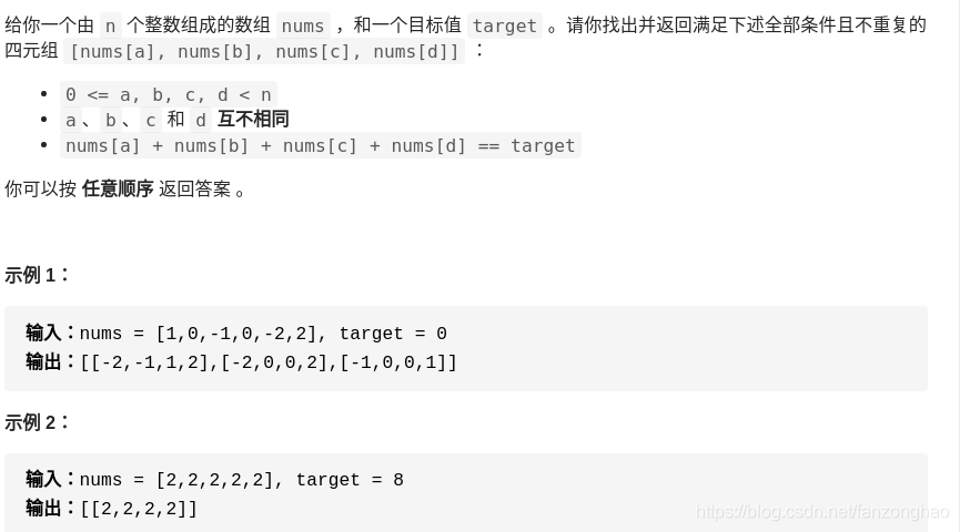 class Solution(object):def fourSum(self, nums, target):""":type nums: List[int]:type target: int:rtype: List[List[int]]"""nums = sorted(nums)ans = set()for i in range(len(nums) - 3):#第一层循环到达三个数之前for j in range(i + 1,len(nums) - 2):#最后两个数需要固定start = j+1 end = len(nums)-1while(start < end):temp = nums[i] + nums[j] + nums[start] + nums[end]if temp == target:ans.add((nums[i], nums[j], nums[start], nums[end]))start += 1end -= 1elif temp > target:end -= 1else:start += 1return list(ans)