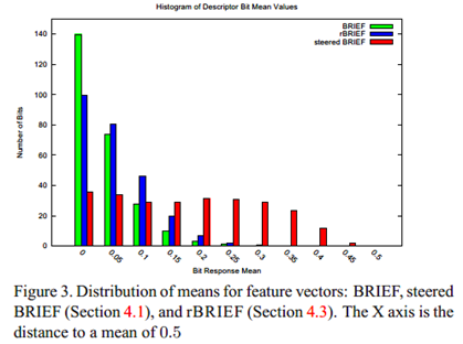 对100k个特征点,基本的BRIEF方法采取了典型的高斯分布,得到256bits的描述子。对每一个特征点,bit mean=number of 1/256.可以看到BRIEF算法的均值更接近于0.5,Steered BRIEF失去了均值为0.5的特性,而接近于均匀分布。rBRIEF是对Steered BRIEF的改进,在保留了旋转不变的同时也保留均值接近0.5的特性。文中作者提到了另外一种理解的角度:有了方向信息的描述子因为更加归一化(more uniform appearance)而均值才更加分散。