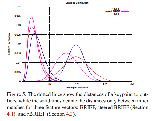 Steered BRIEF中特征点的与outliers的距离的均值更小,但是与inliers的重叠也更大。