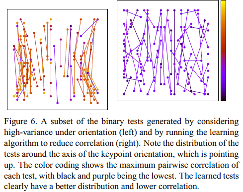 于是,继续改进,我们的目标不仅是使得描述子对旋转不变,还要有大方差,0.5的均值,在tests之间还要保证低相关性,这就是rBRIEF方法。一个思路是继续使用PCA,这也在SIFT基础上被使用过,可以从高维向量中提取出互不相关的特征向量,从而减少了冗余的信息。但是,二进制tests的空间过大,不便使用PCA,且为了得到256bits大小的无关的描述子,我们就必须在最初找到更高维的描述子,这就反而降低了效率。所以我们最好可以直接找到不相关的tests。文献21,27使用offline clustering找到不相关的examplars。在ORB论文中,在所有可能的二进制tests中贪婪查找,找到满足三个条件的tests。