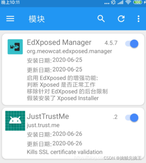 - Edxposed: 使用面具模块功能刷入Edxposed模块,重启安装, Edxposed.apk激活即可使用