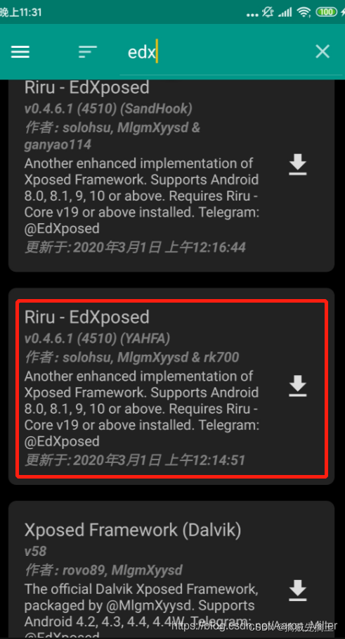 安装 EdXposed 管理器(管理xposed插件的开启和关闭),下载地址: