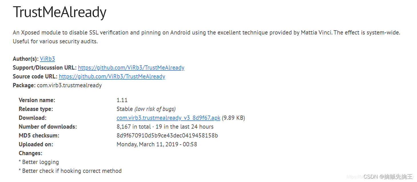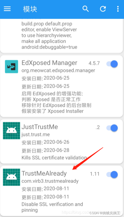 JustTrustMe难以在Android系统上起作用,这里需要使用 TrustMeAlready:TrustMeAlready | Xposed Module Repository