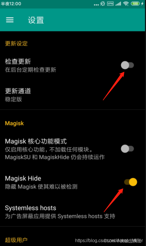 关闭检查更新、开启 Magisk Hide(使一些金融APP难以对当前环境进行检测)