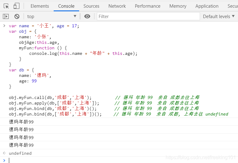}obj.myFun.call(db,'成都','上海'); // 德玛 年龄 99 来自 成都去往上海