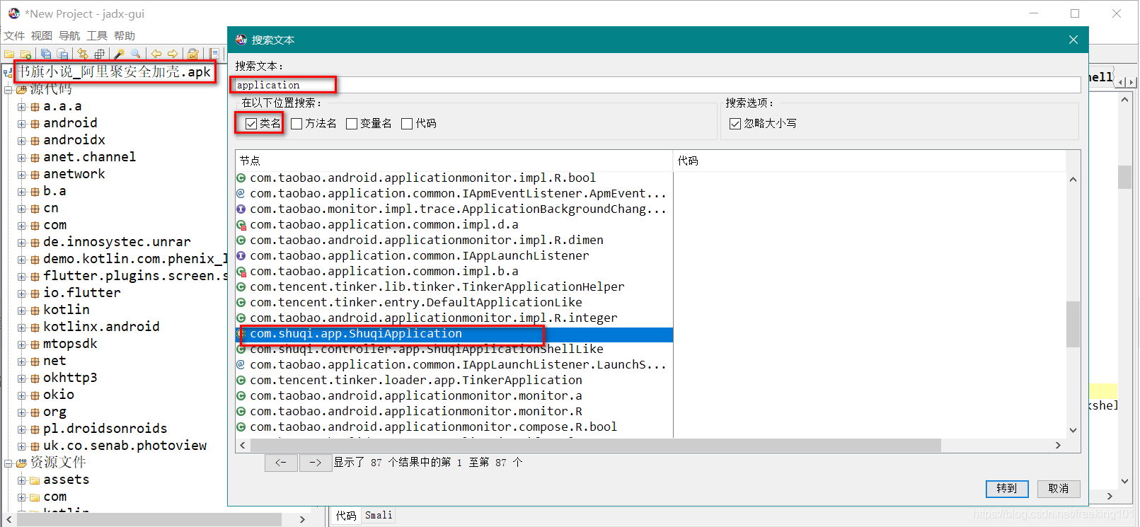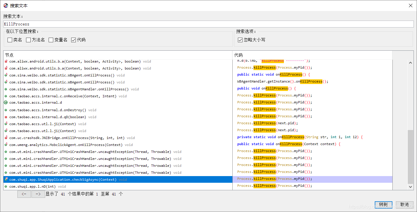 3. 打开 jadx-gui 分析代码,搜索 "KillProcess" 根据 ddms 信息 发现它调用了 com.shuqi.app.ShuqiApplication 包里面的方法 我们跳转到里面去