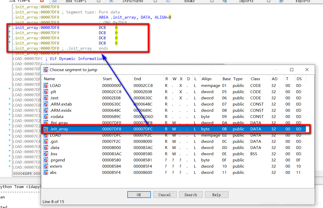 Ctrl + s 打开 段选择 窗口,选择 init_array 点击进入 init_array 对应代码位置