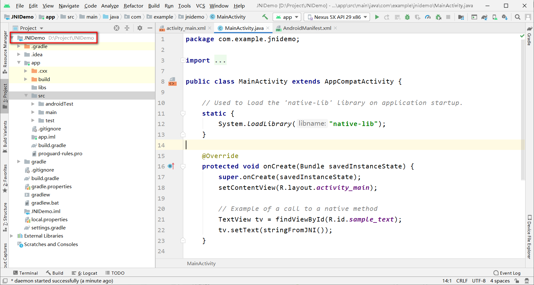 7、在MainActivity.java测试类中调用JavaJNI.java类中本地声明的方法