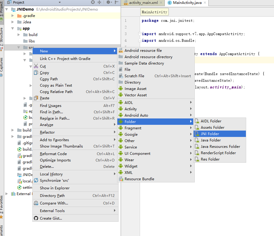 创建 jni 文件夹:src 右键 ---> New ---> Folder ---> JNI Folder 如图: