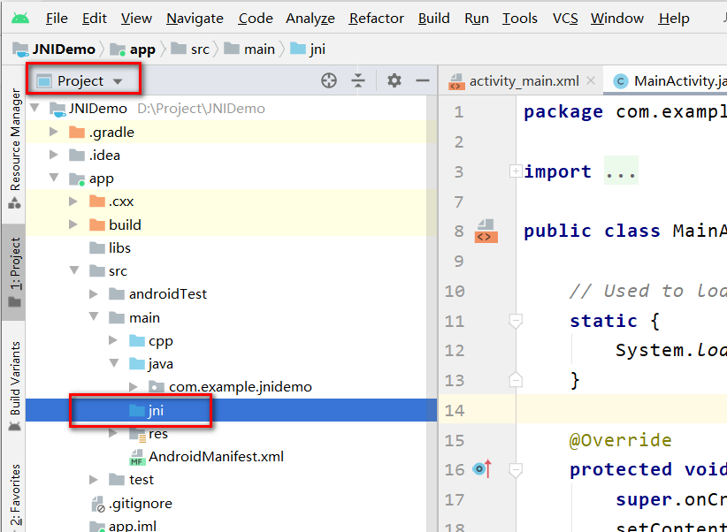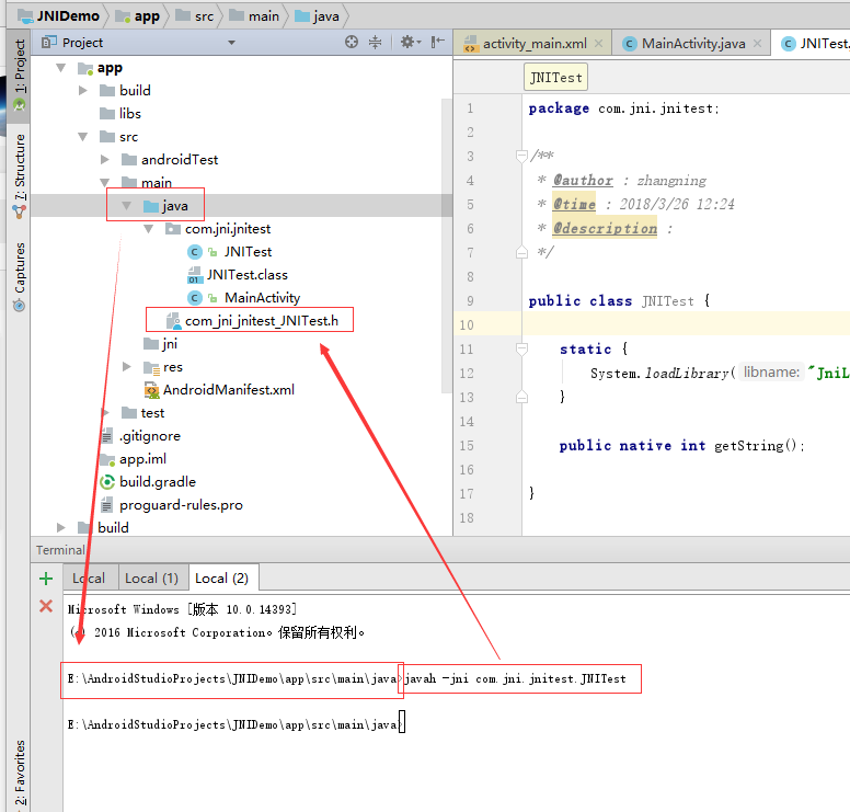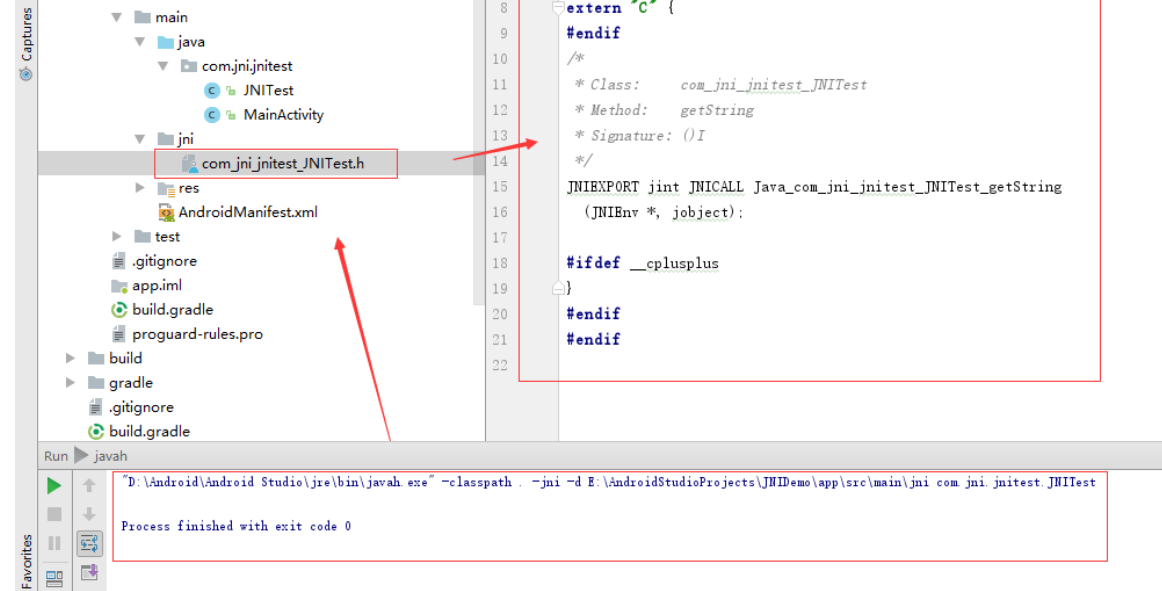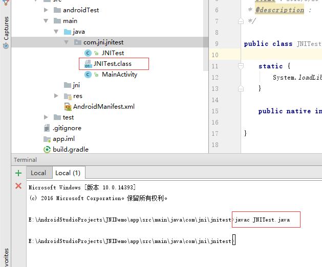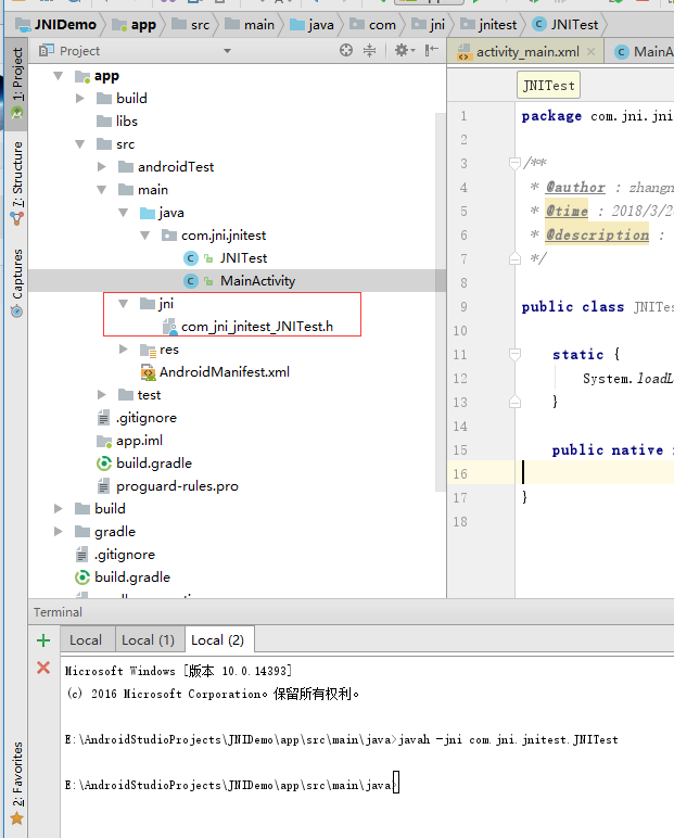 必须在包名外使用 javah 命令,编译生成.h文件,把.h文件移动到jni文件夹(生成.h文件后可以删除class文件)如图: