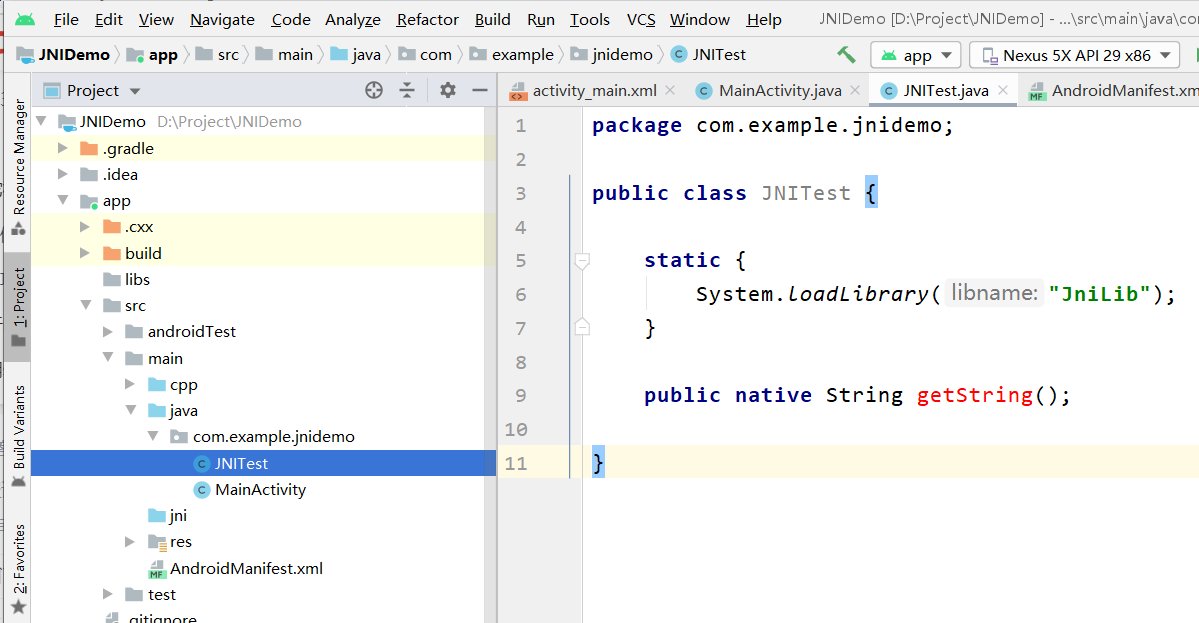 public class JNITest {static {System.loadLibrary("JniLib");}public native String getString();}