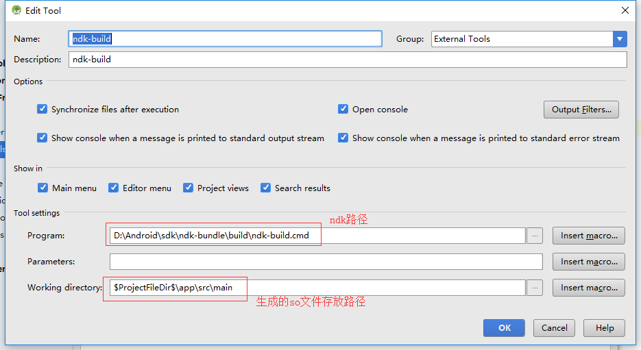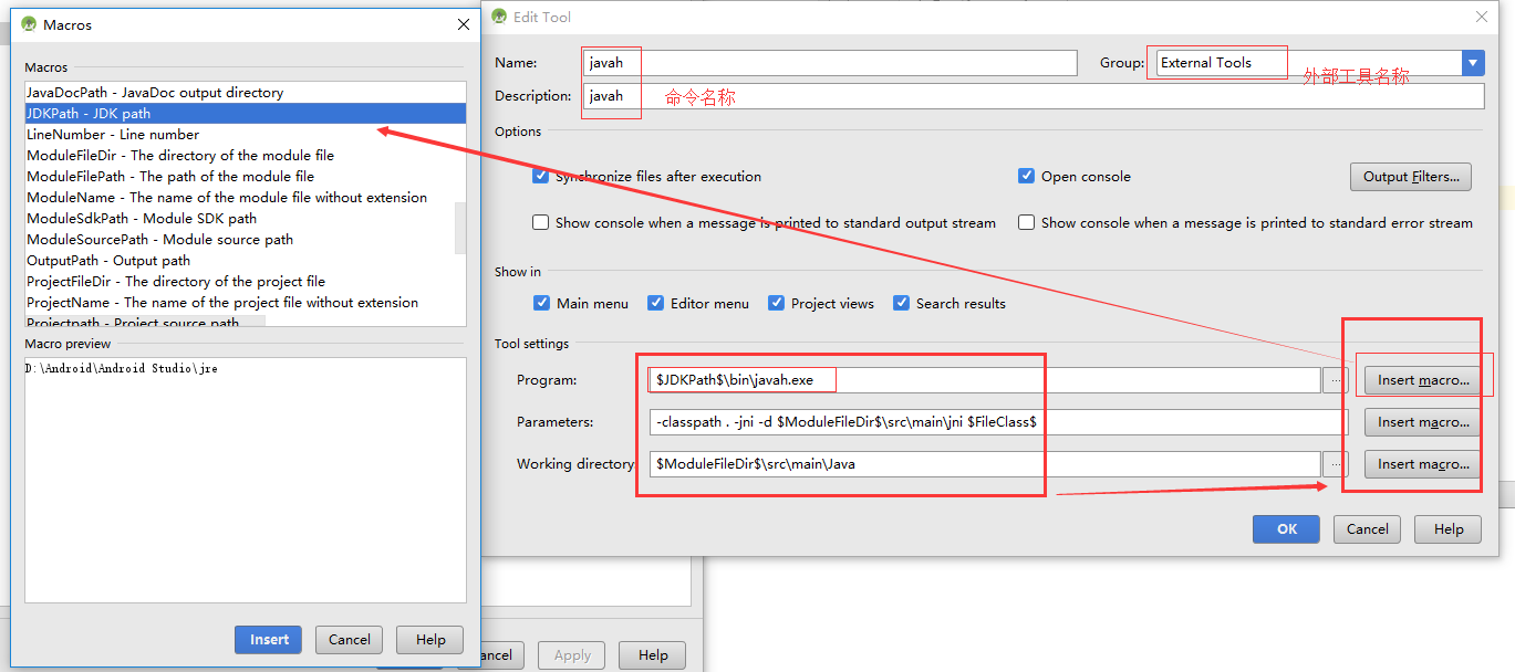 Program:$JDKPath$\bin\javah.exeParameters:-classpath . -jni -d $ModuleFileDir$\src\main\jni $FileClass$Working directory:$ModuleFileDir$\src\main\Java注释:-classpath classes 指明类所在的位置-jni com.jni.jnitest.JNITest 类的绝对路径-d 产生的.h文件放到指定目录下;