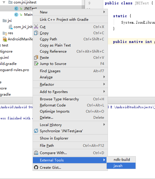 4、鼠标选中刚刚新建的含有本地实现方法的类,右击选择External Tools的Javah, 随机在弹出的窗口输入名字(这个名字就是马上生成的C或C++头文件的名字,文件会保存在/src/main/jni/下面),这样我们的C或C++头文件就生成好了,在JNI文件下,