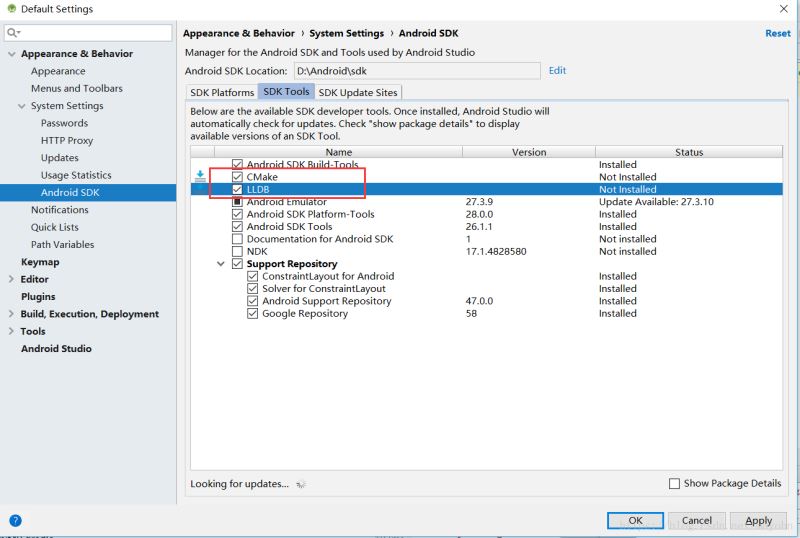 在 File - Settings ...,下查看 NDK 安装配置情况,如果没有下载配置 NDK ,以及相关的包,对应下载相关的安装包。