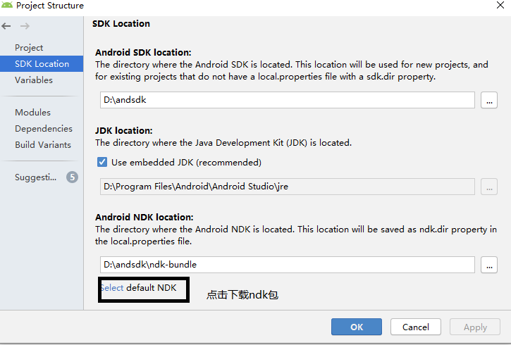 下载安装好后,可以在 File - Project Structure 的 SDK Location 下查看对应的安装配置路径情况,