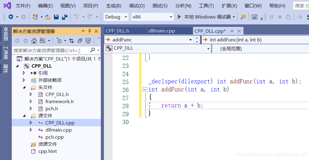在 CPP_DLL.cpp 文件中添加下面的函数,在函数声明前添加 _declspec(dllexport) 关键字