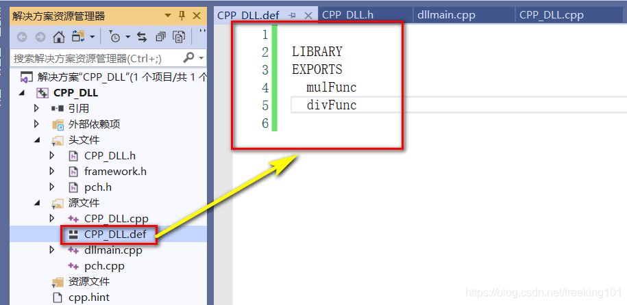 在项目中定义CPP_DLL.def 文件,该文件为模块导出文件