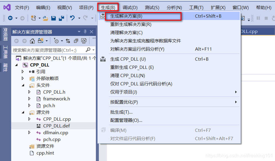 然后点击 “ 生成解决方案 ” ,就可以在工程目录的 debug 目录或者 release 目录下(这取决你生成的是debug版本还是release版本)生成了动态链接库的相关文件。第三方调用时关键的文件为 .lib文件 和 .dll文件 以及工程目录下的 .h头文件 。