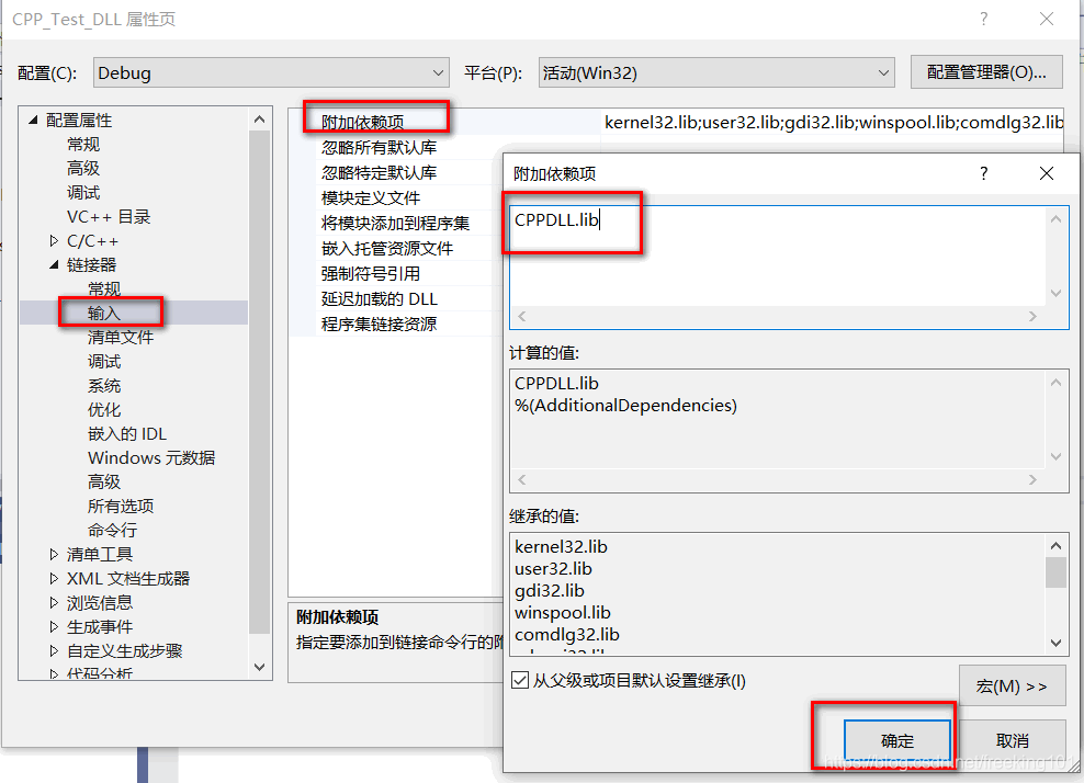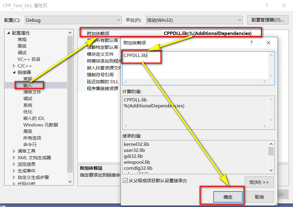 - 然后在项目中引入 CPPDLL.lib 文件。 链接器 -> 输入 -> 附加依赖项 -> 编辑