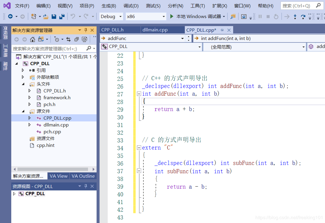 在 CPP_DLL.cpp 文件中添加下面的函数,在函数声明前添加 extern "C" _declspec(dllexport) 关键字
