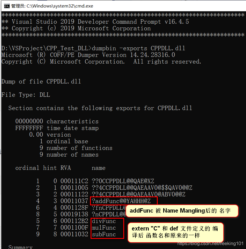 VS2019 自带的工具 dumpbin.exe 可以查看编译后的 动态链接库对应的 函数名。