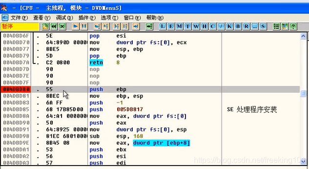 既然找到了关键的 call 调用的位置,所以也应该在函数开始的位置下个断点( 即机器码 是 55 的位置,对应汇编代码为 push ebp ):