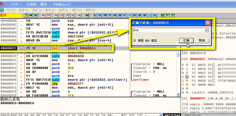 通过单步调试分析可知,jnz 位置是 跳过 neg 窗口的关键,直接 nop 掉( 更改原则:越早更改越好 )