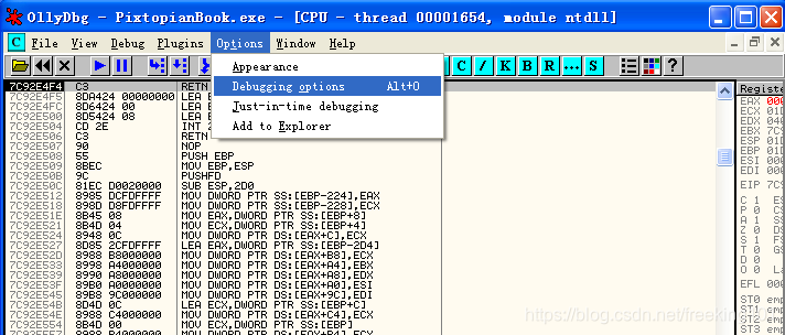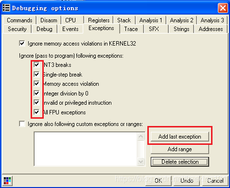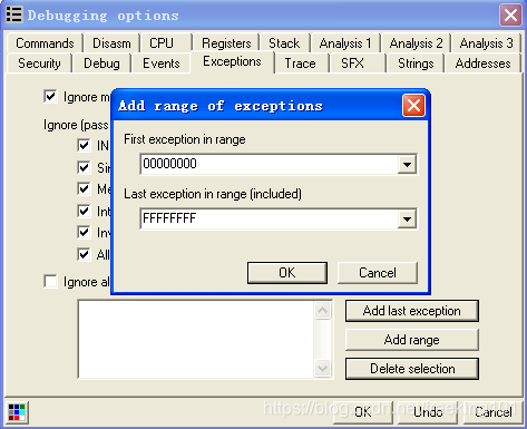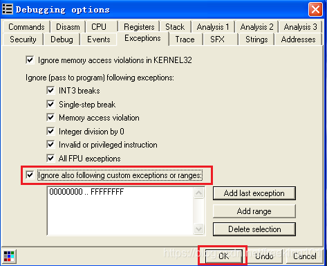 我们将其载入OD(建议下载一个原版OD#www.ollydbg.de#,我们尝试手动配置忽略异常)如图: