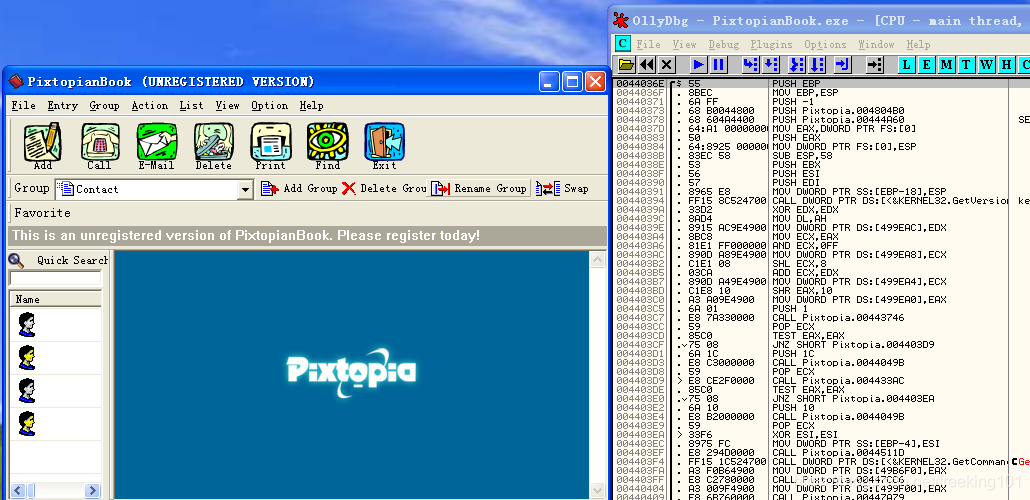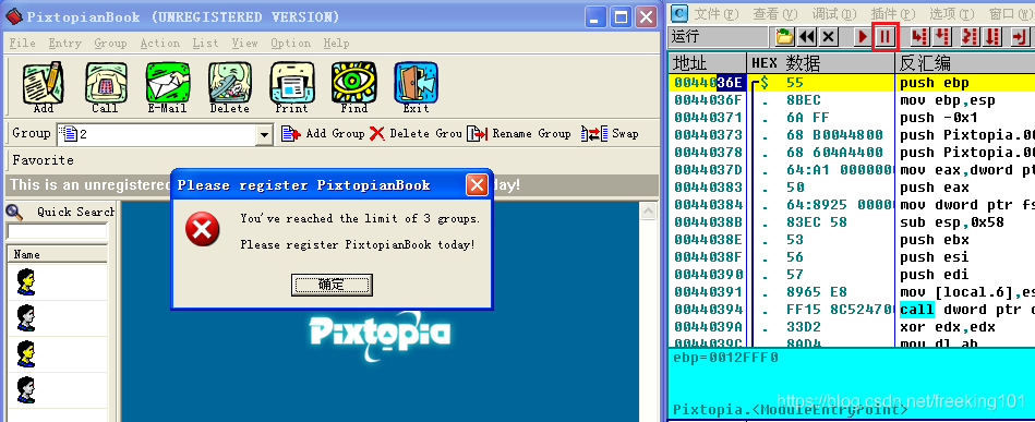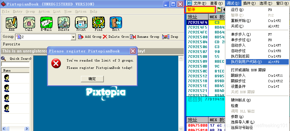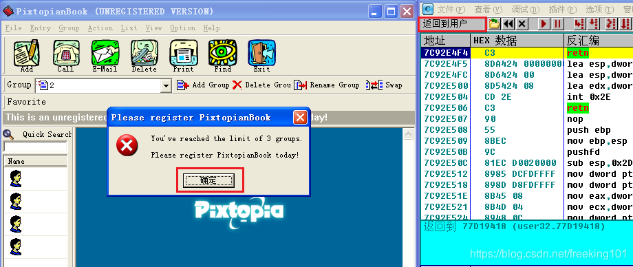 3、比较eax与4的大小(联系人是否已经有4个),如果小于等于(JL)4个,那就跳过消息框,否则弹出未注册消息框。