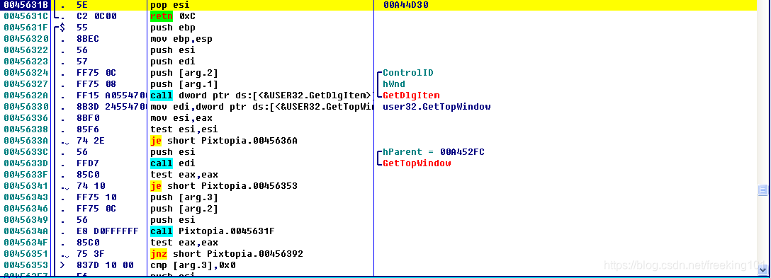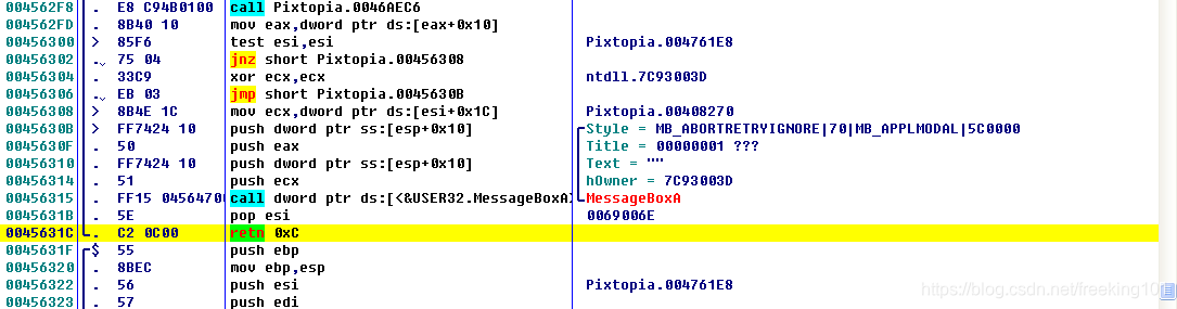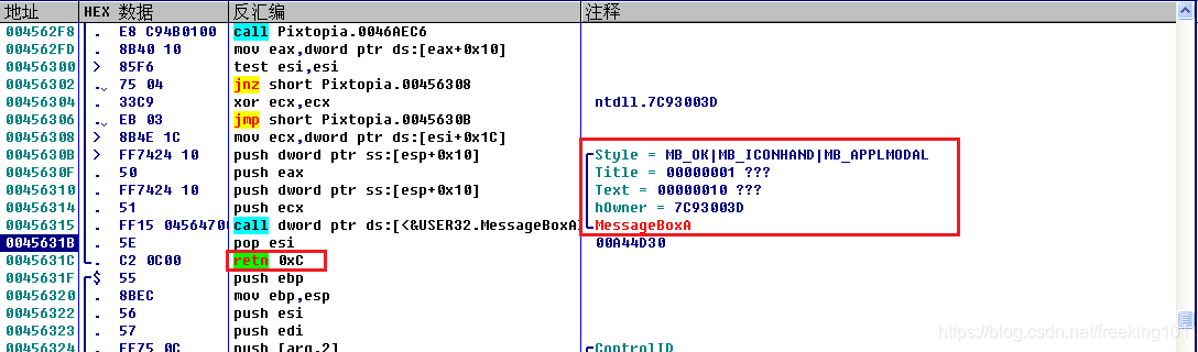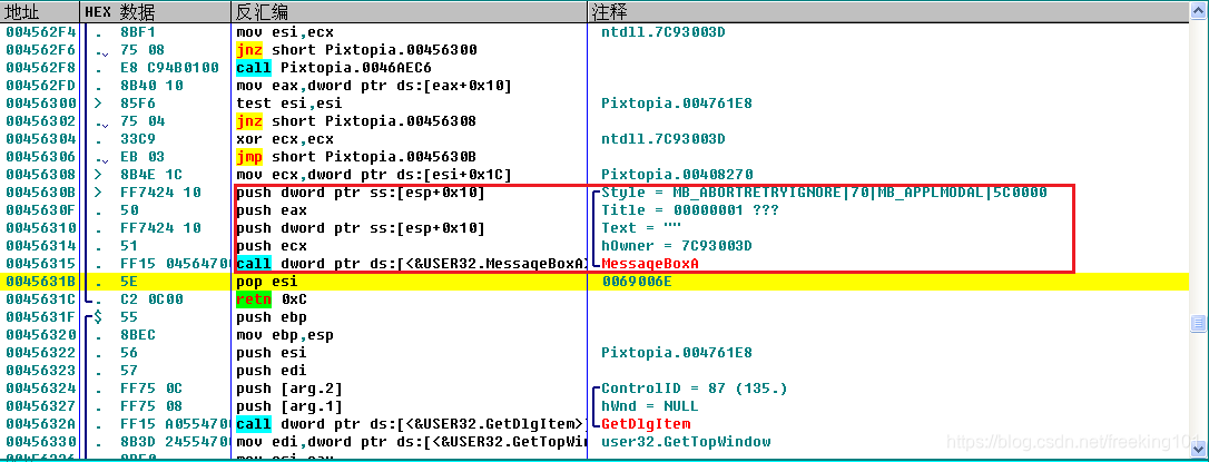 跳转到这个位置,我们向上翻,看到同样的MessageBox,如下: