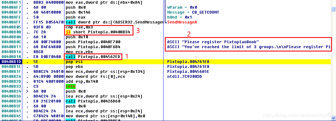 3.这里有一个cmp,比较eax与3大小(即Group是否等于3),如果小于就跳转到(JL)00408B34,如果已经有3个Group了,就执行call弹出未注册消息框。