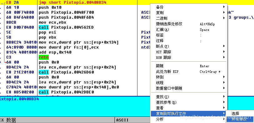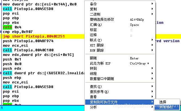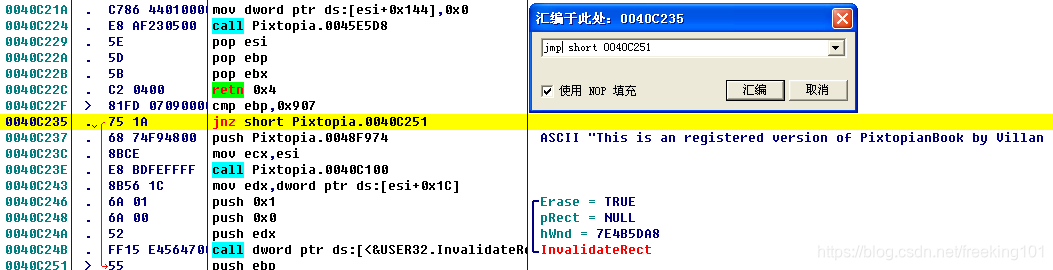 这个程序我们已经完全弄清楚了,我们直接在0040C235的jnz处进行强制跳转,让其不会将这串字符压入栈: