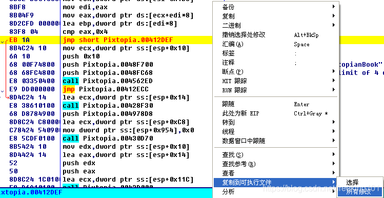 发现上面有一处cmp和jnz(cmp与jnz组合代表:如果不相等,则跳转),如果ebp等于907,则将这串字符压入栈(可以猜测,907代表未注册),我们根据跳转向上翻: