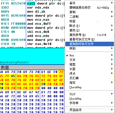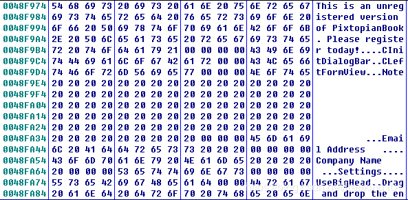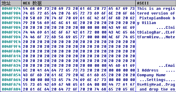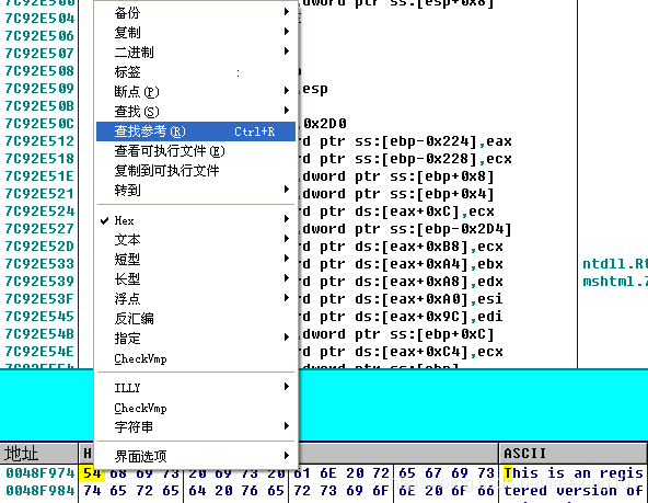 通过上面的操作我们已经知道了注册文字在48F974处,在dump(数据窗口)窗口右键跳转到48F974