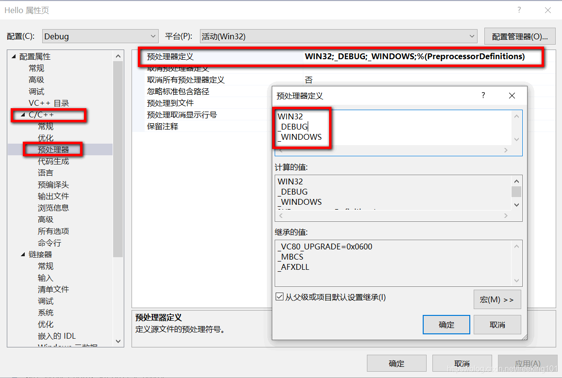- 2. 在左边栏中依次选择:配置属性 -> C/C++ -> 预处理器,然后在右边栏的 预处理器定义对应的项中删除 _CONSOLE,添加 _WINDOWS