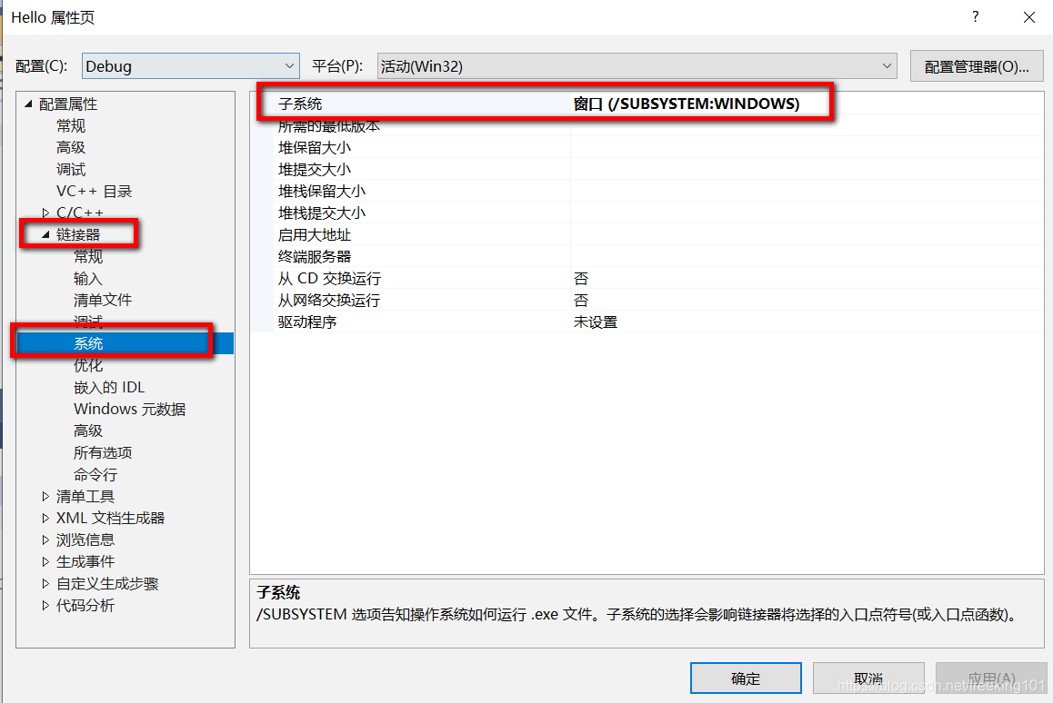- 3. 在左边栏中依次选择:配置属性 -> 链接器 -> 系统,然后在右边栏的 子系统 对应的项改为Windows(/SUBSYSTEM:WINDOWS)