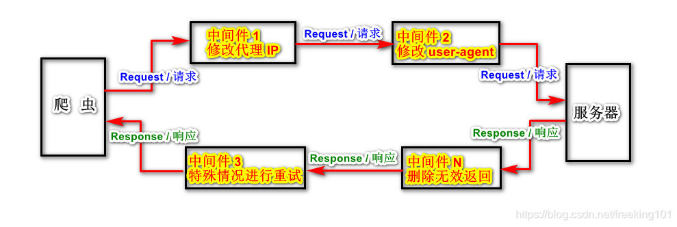 使用了中间件以后,爬虫的流程如下图所示。