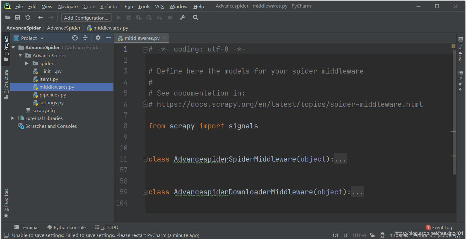 创建完 Scrapy 工程以后( 这里创建的工程名为 AdvanceSpider ),工程文件夹下会有一个 middlewares.py 文件,打开以后其内容如下图所示: