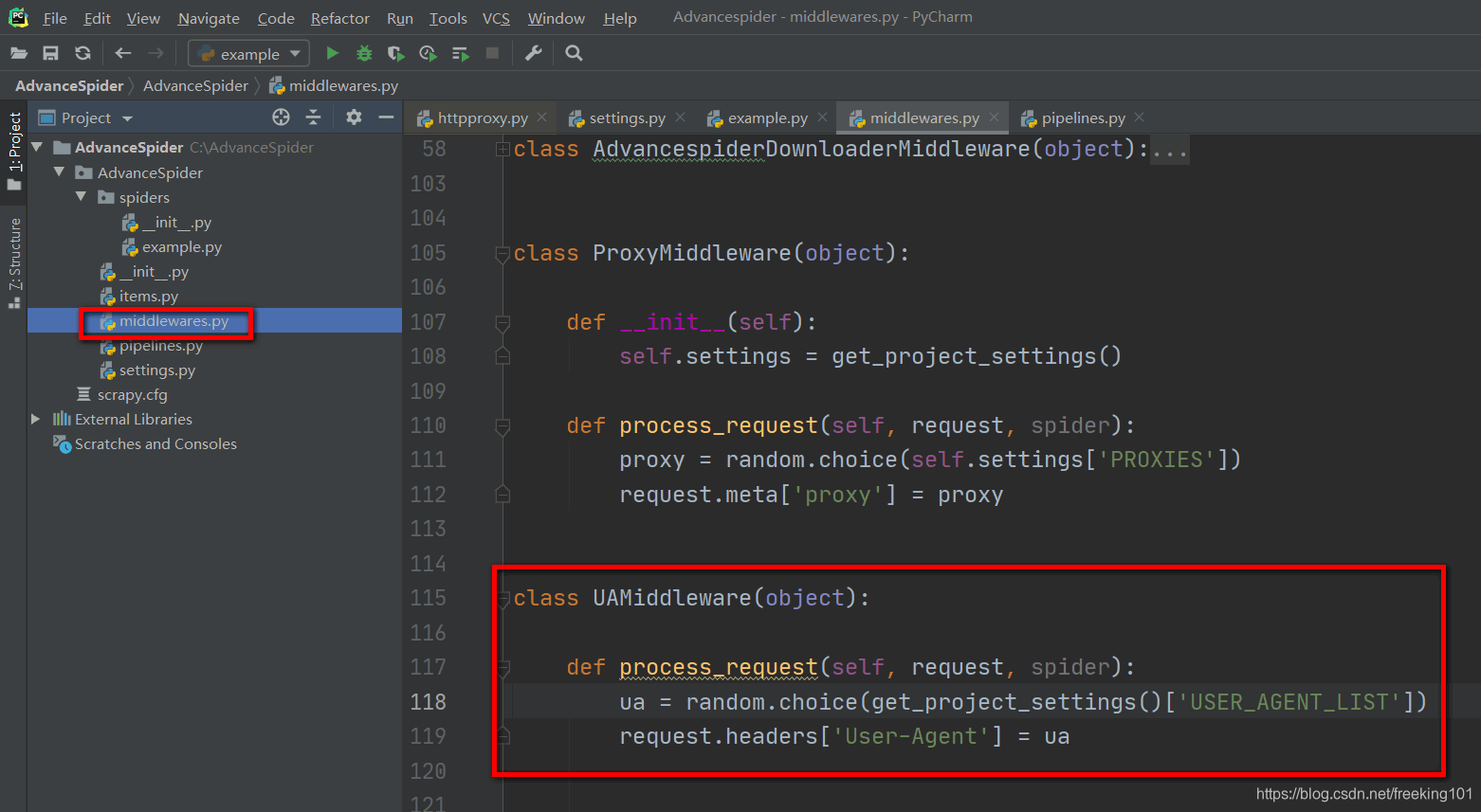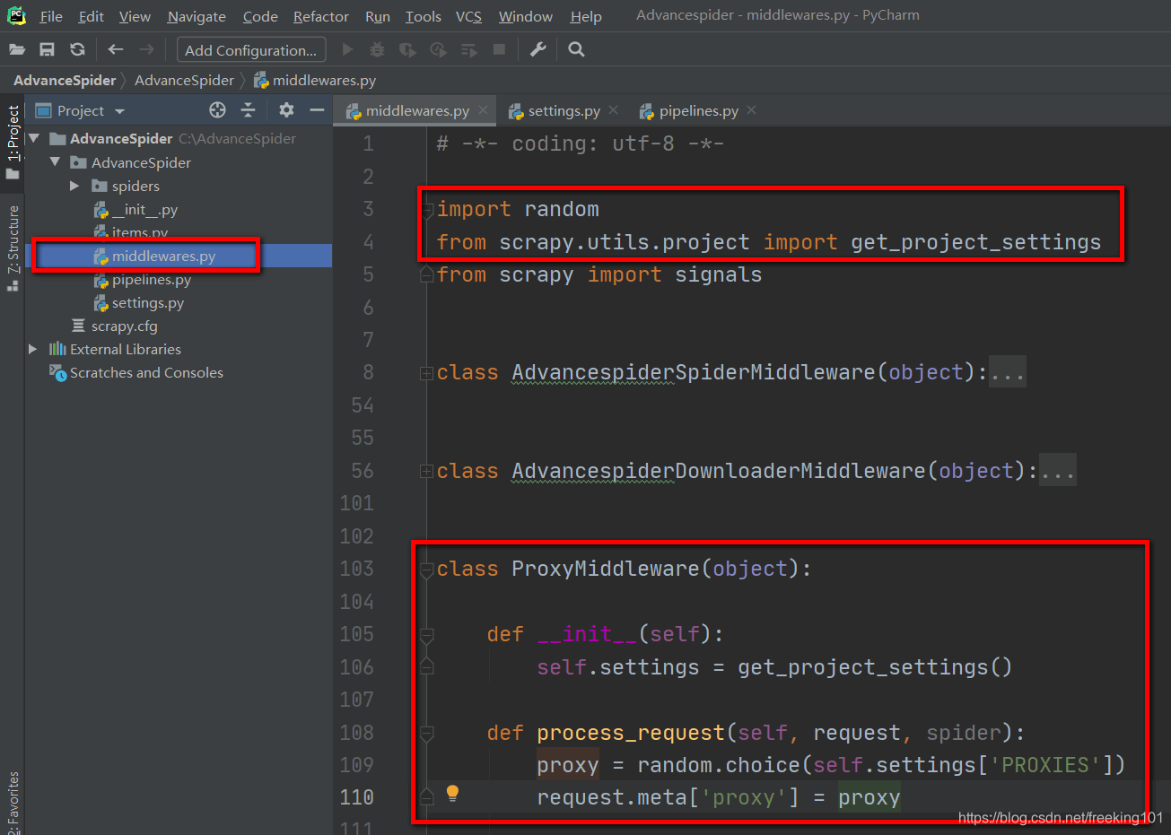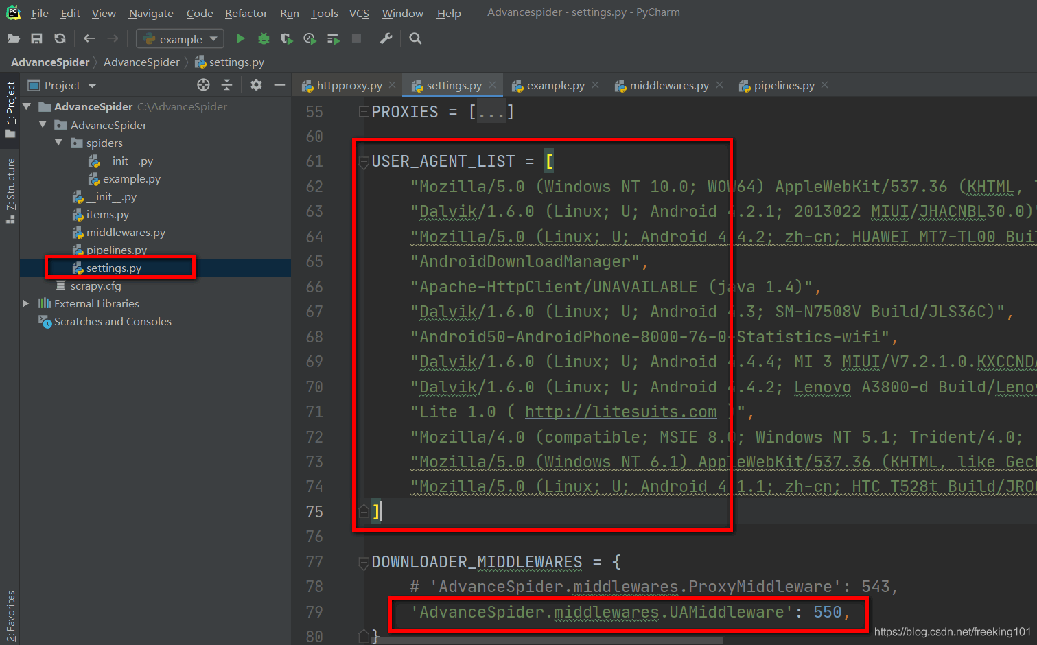 DOWNLOADER_MIDDLEWARES = {'AdvanceSpider.middlewares.ProxyMiddleware': 543,'scrapy.contrib.downloadermiddleware.useragent.UserAgentMiddleware': None,'scrapy.contrib.downloadermiddleware.httpproxy.HttpProxyMiddleware': None