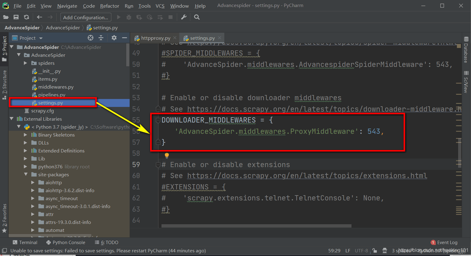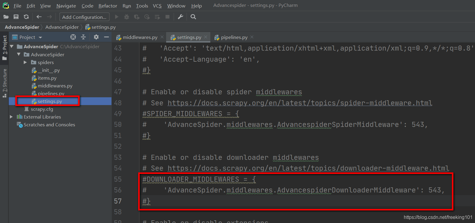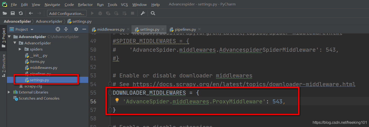 DOWNLOADER_MIDDLEWARES = {'AdvanceSpider.middlewares.ProxyMiddleware': 543,