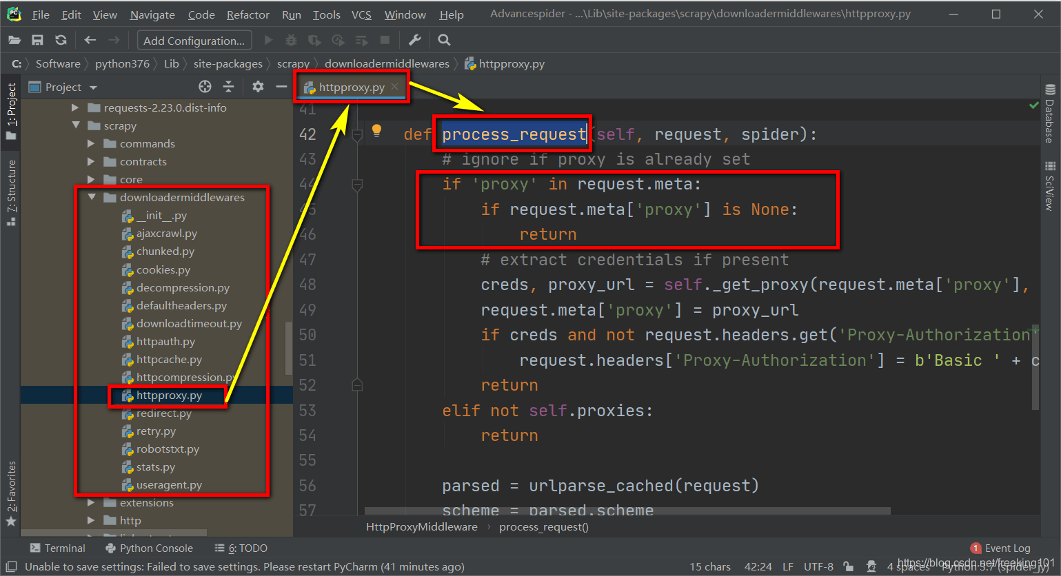 修改前面开发的重试中间件,添加一个process_exception()方法。这个方法接收3个参数,分别为request、exception和spider,如下图所示。