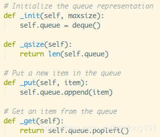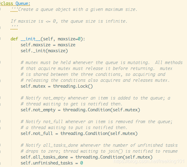 文档注释里写了:创建一个maxsize大小的队列,如果<=0,队列大小是无穷的。设置了maxsize,然后调用self._init(maxsize),点进去看下: