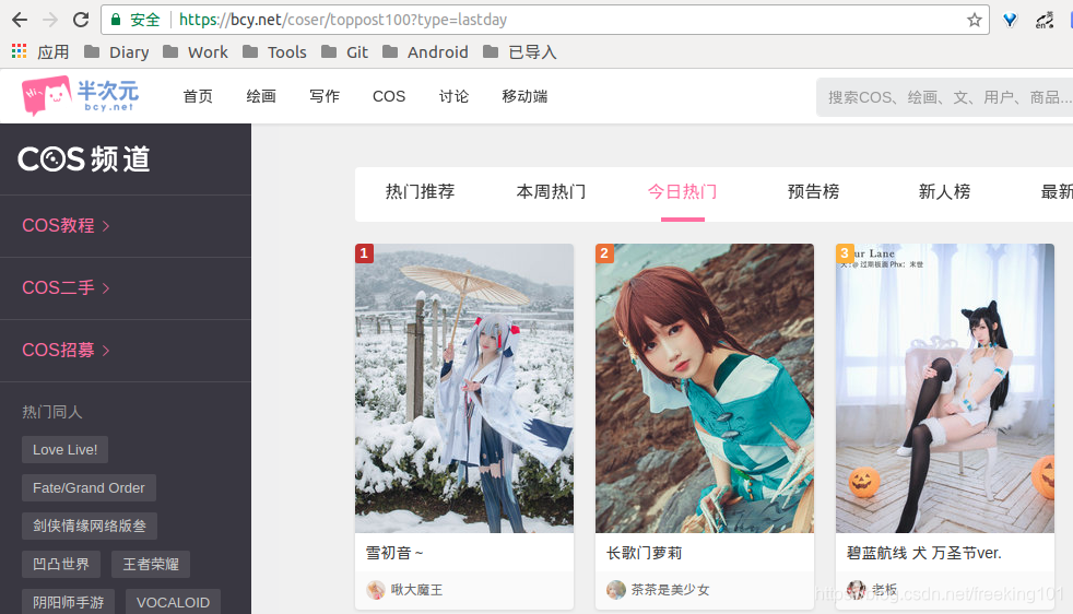 抓取源:https://bcy.net/coser/toppost100?type=lastday
