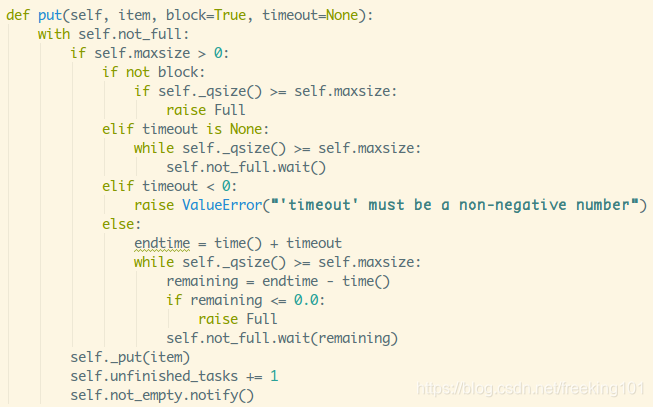- 2.block为True,没设置超时:堵塞队列,判断当前大小是否大于等于容量,