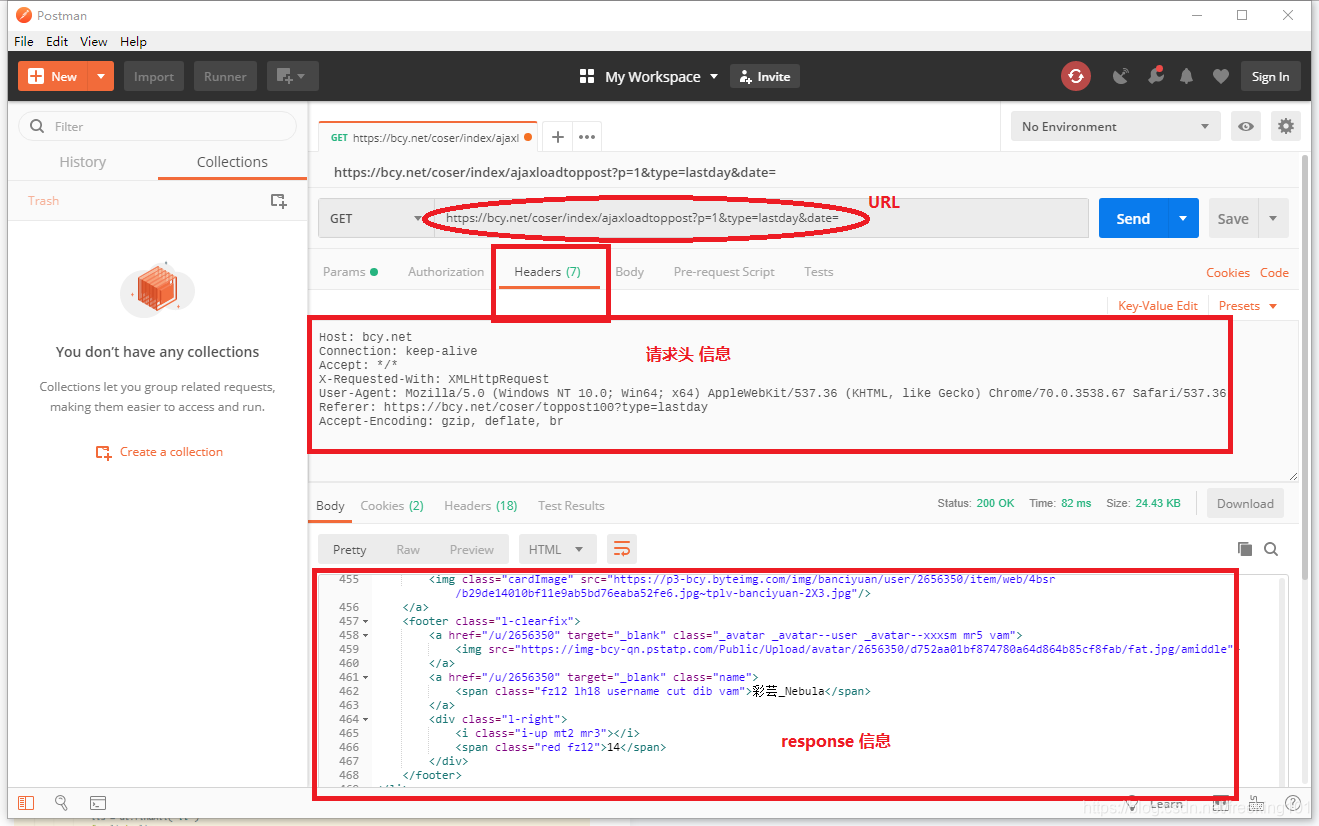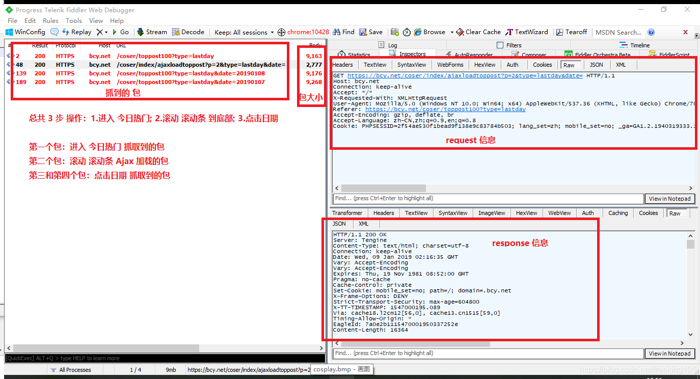 URL https://bcy.net/coser/index/ajaxloadtoppost?p=2&type=lastday&date= 中 有 3 个参数,p 猜测代表 页码(page), type 值固定,date 代表日期。