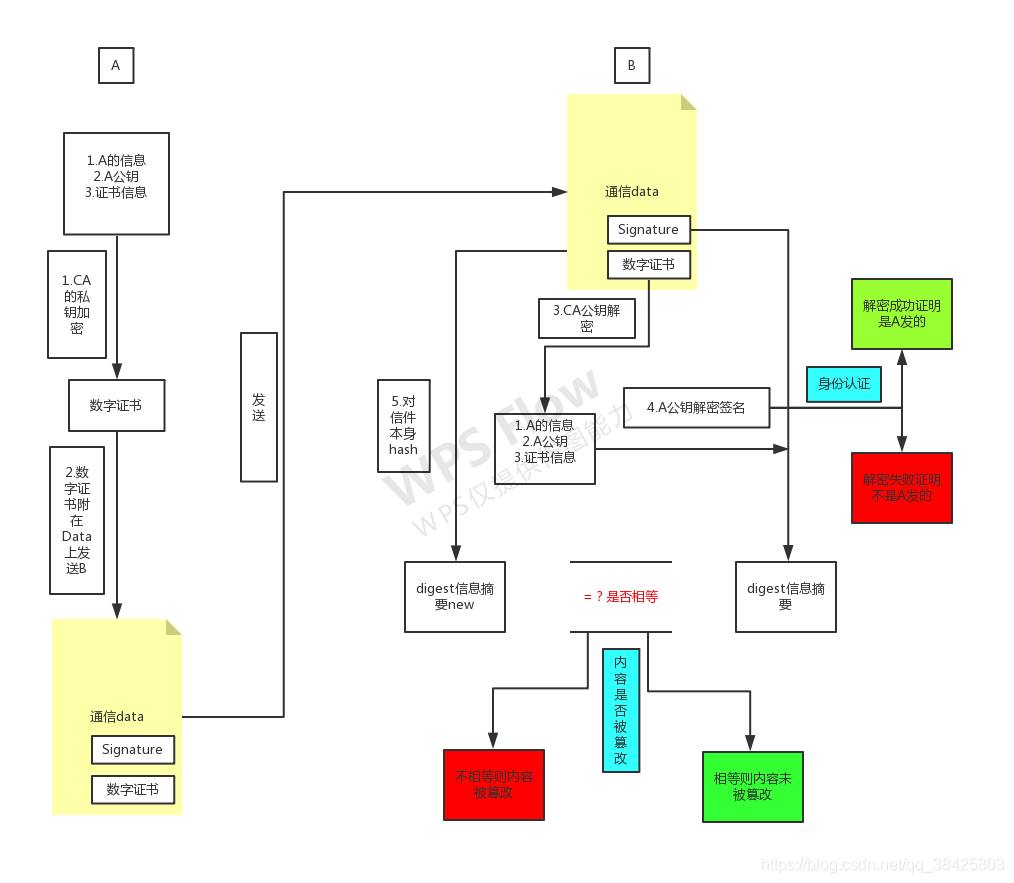 1.A先用Hash函数,对通信data生成通信data的摘要(digest)