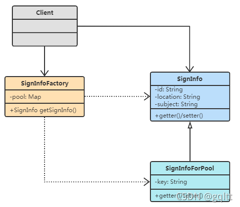public class SignInfoFactory {/*** 池容器.*/private static Map<String, SignInfo> pool = new HashMap<>(64);public static SignInfo getSignInfo(final String key) {// 设置返回对象.SignInfo result = null;// 池中没有该对象,则建立,并放入池中.if (!pool.containsKey(key)) {System.out.println(key + "----建立对象,并放置到池中.");result = new SignInfoForPool(key);pool.put(key, result);} else {result = pool.get(key);System.out.println(key + "----直接从池中取得.");}return result;}