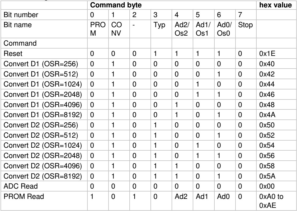 MS5837压力传感器拥有5类基本命令:复位、读取出厂校准值、数据1转换(压力值数据)、数据2转换(温度值数据)和读取ADC的转换结果。具体分配如下: